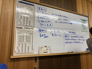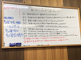 担当者が予め考えてきた質問が黒板に書き出されました。今日、どうしても参加できない人は、前回の講座の後すぐに宿題として、これらの質問に答えて、書き送っていた人もいました。