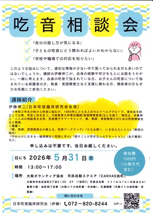 相談会の場には、長年、自分の吃音とつきあってきた、経験豊かな成人のどもる人がいます。また、21歳まで吃音に深く悩み、その後、大阪教育大学の言語障害児教育の教員を経て、言語聴覚士養成の大学や専門学校で吃音の講義を続けてきた伊藤伸二がいます。伊藤は、現在、ことばの教室や言語聴覚士と共に、どもる子どもの幸せを考えて、活動を続けています。